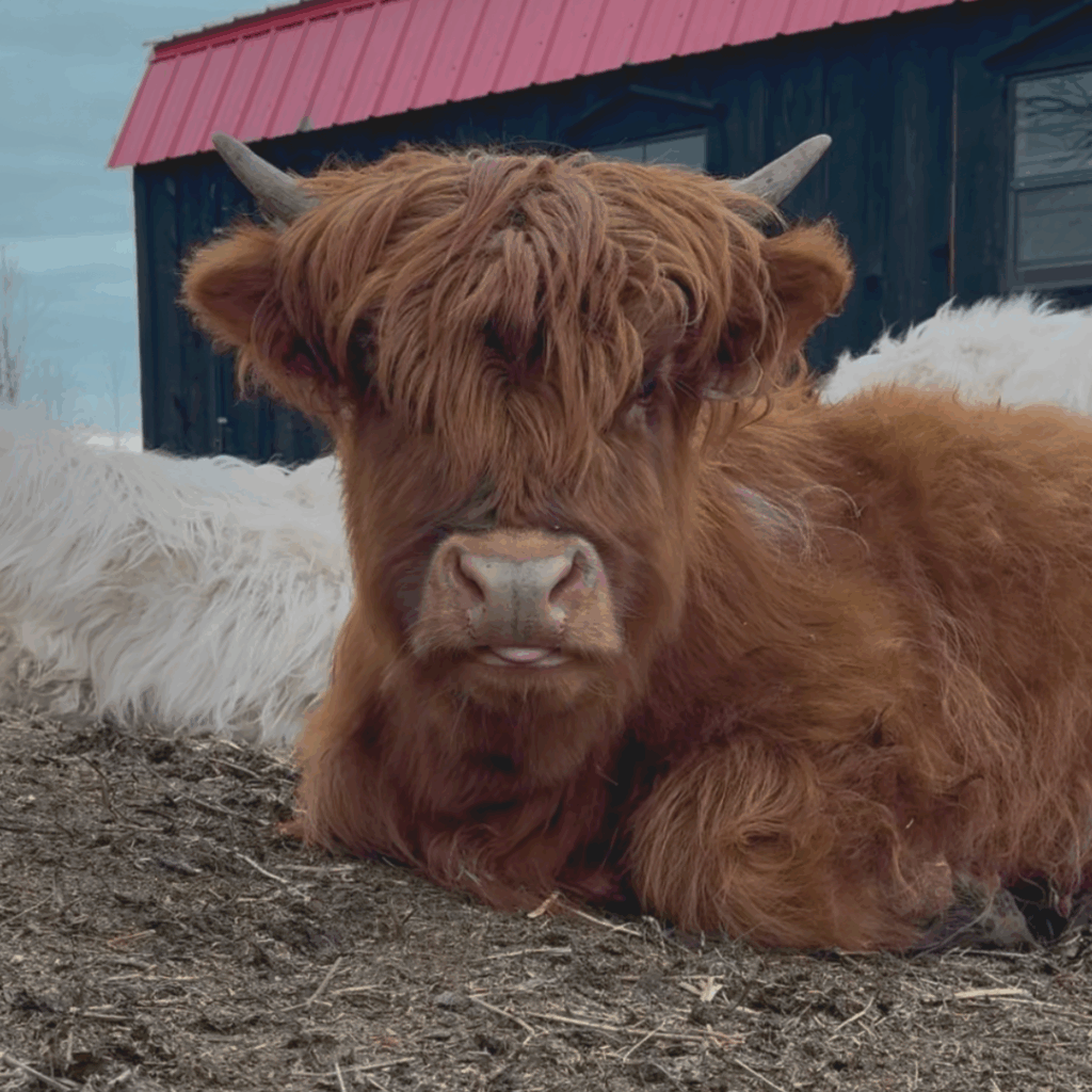 Big Red is a stunning red brindle Highland heifer with a big heart (and an even bigger voice). She loves her grain and isn’t shy about telling you exactly what she wants — you’ll hear her happy moo from across the pasture! With her sweet nature and bold personality, Big Red makes sure no one ever forgets she’s around.